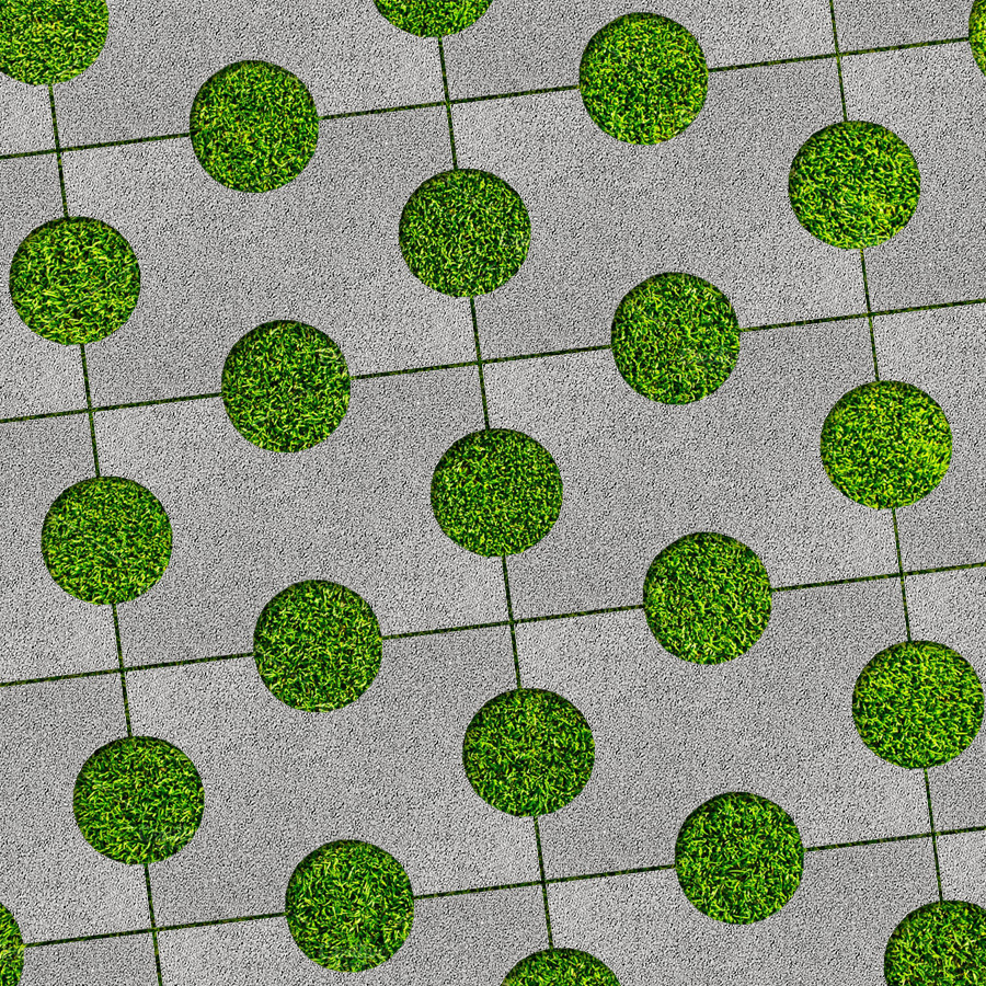 Egyedi hangulatú, minőségi betonból készült, szürke színű öko gyepkő, amelynek kör alakú hézagjai vidám, játékos megjelenést kölcsönöznek a burkolt felületeknek, megnövelve ezzel a zöldfelületi arányt a parkolókban és a köztereken.